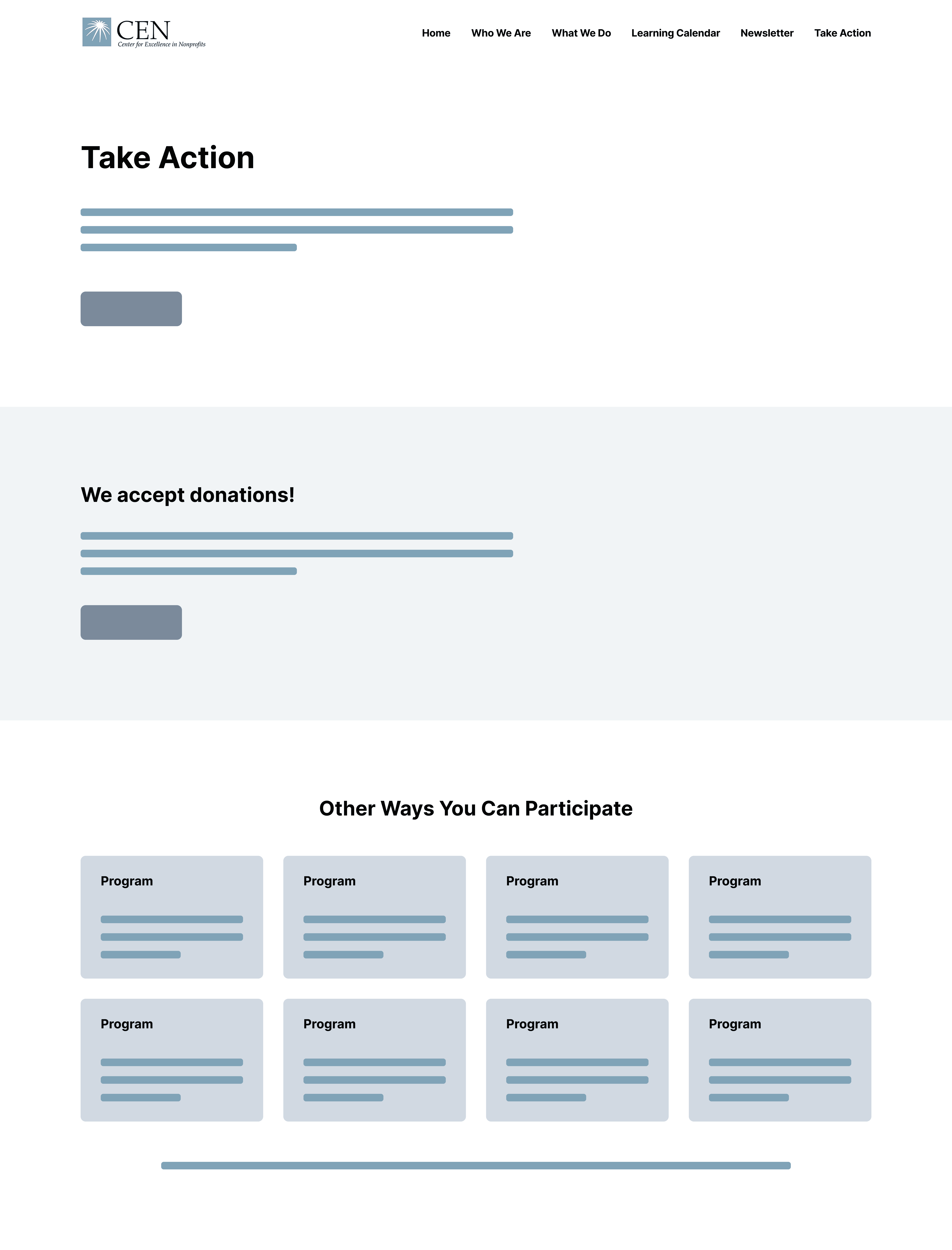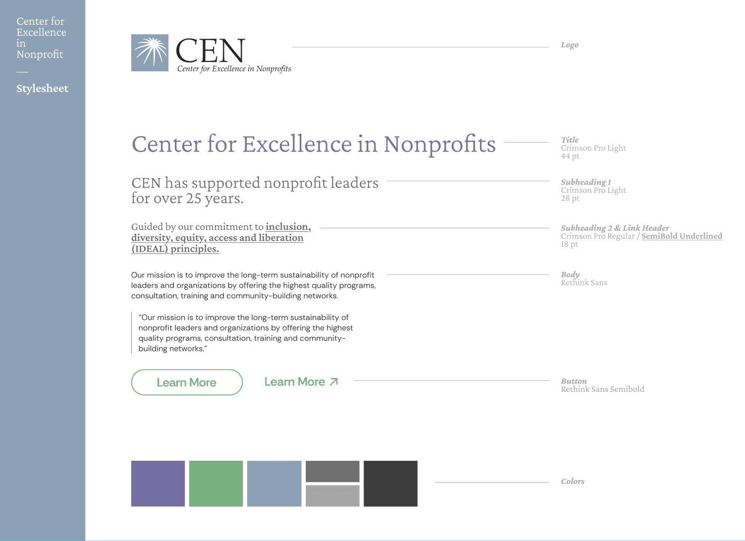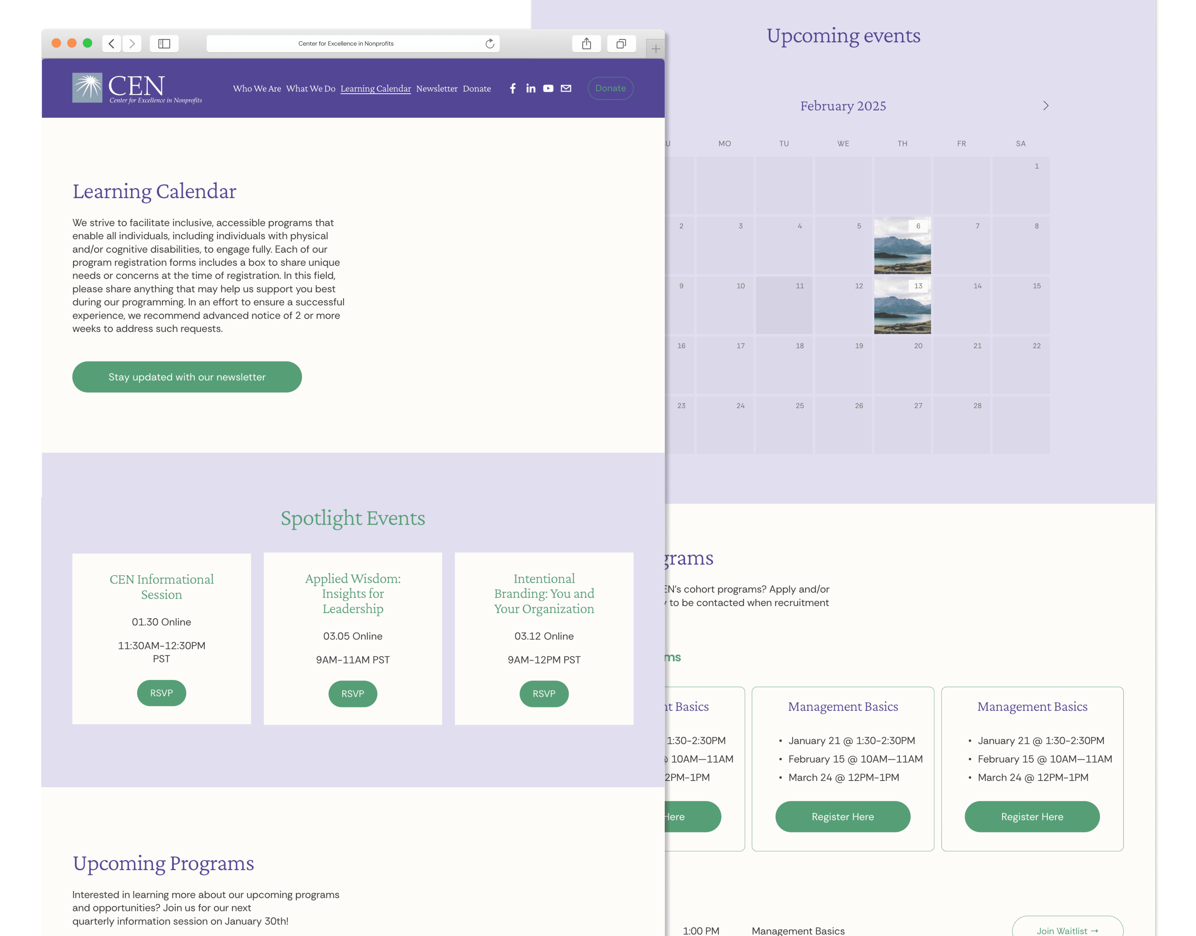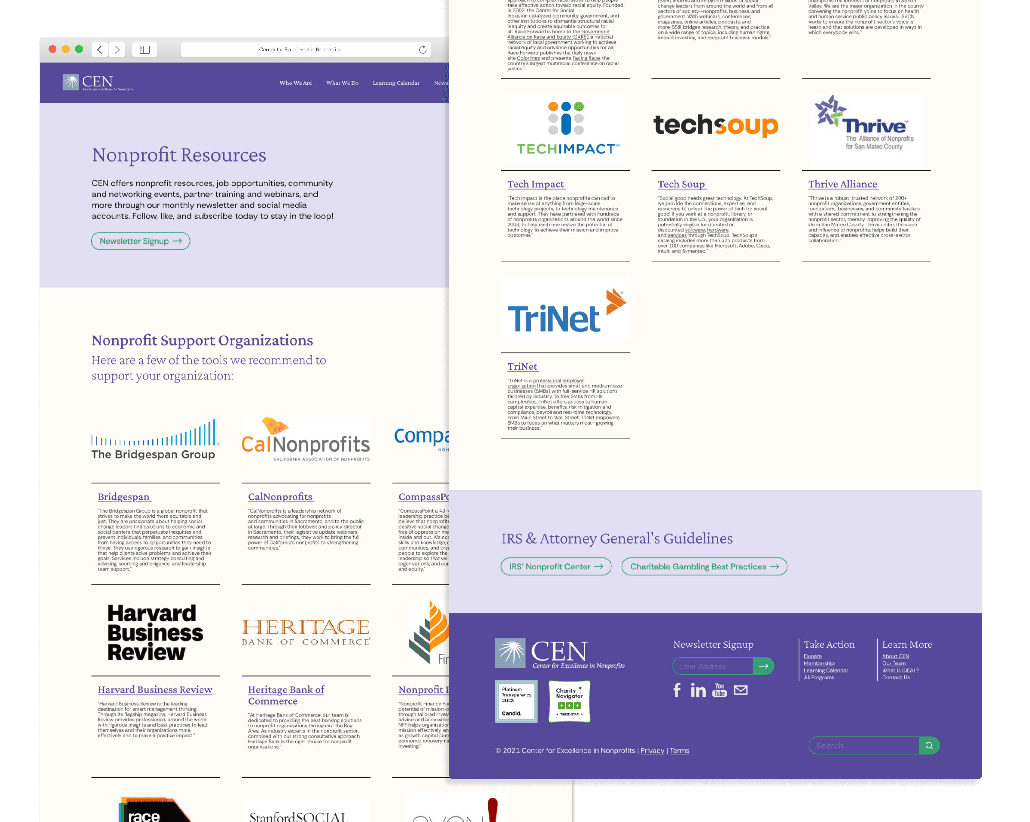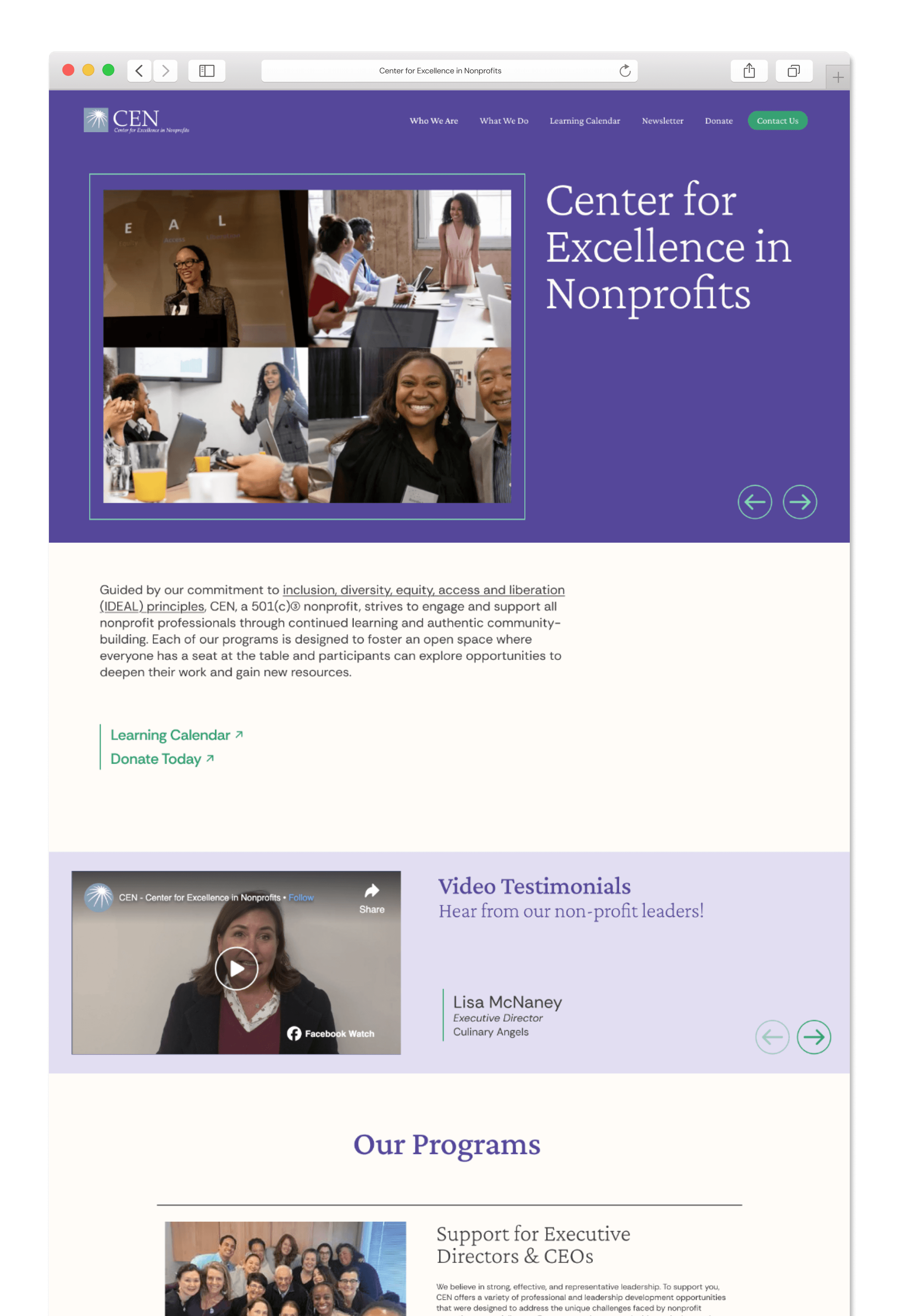 Our team worked closely with the Center for Excellence in Nonprofits (CEN) to gain a deep understanding of their needs and the impact they strive to create. Through discussions with our client, we identified key priorities: an engaging and well-organized website that makes essential resources easy to find and understand. CEN serves nonprofit leaders by providing guidance, training, and support, so it was crucial that the redesigned website offered a seamless user experience that clearly communicated their offerings. By prioritizing accessibility, intuitive navigation, and a visually compelling design, we aimed to create a digital platform that not only enhances engagement but also empowers nonprofit leaders to efficiently access the tools they need to succeed.