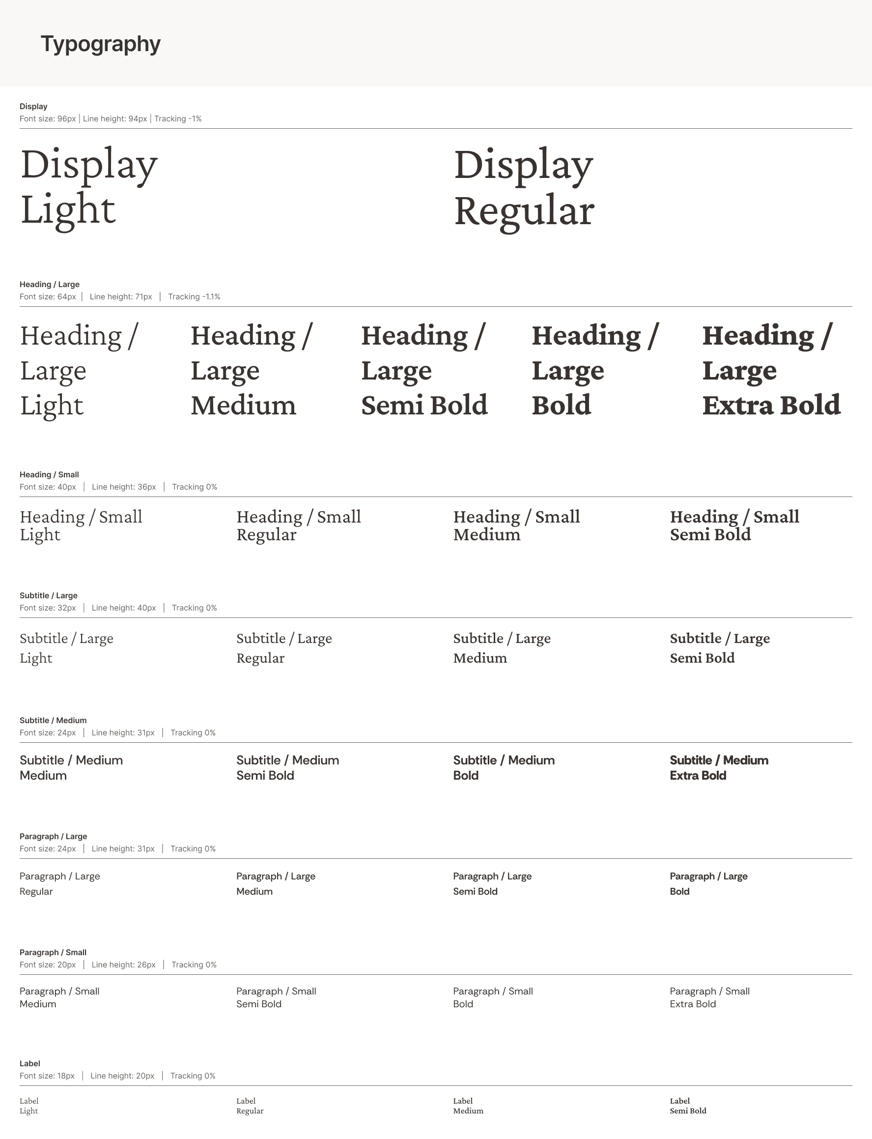 Our typography system is designed for clarity, hierarchy, and scalability across different screen sizes. The Display styles emphasize branding and large-scale visual impact, while Headings, Subtitles, and Paragraphs create a structured reading experience. With variations in weight and size, the type system ensures clear communication while maintaining a modern and professional aesthetic.