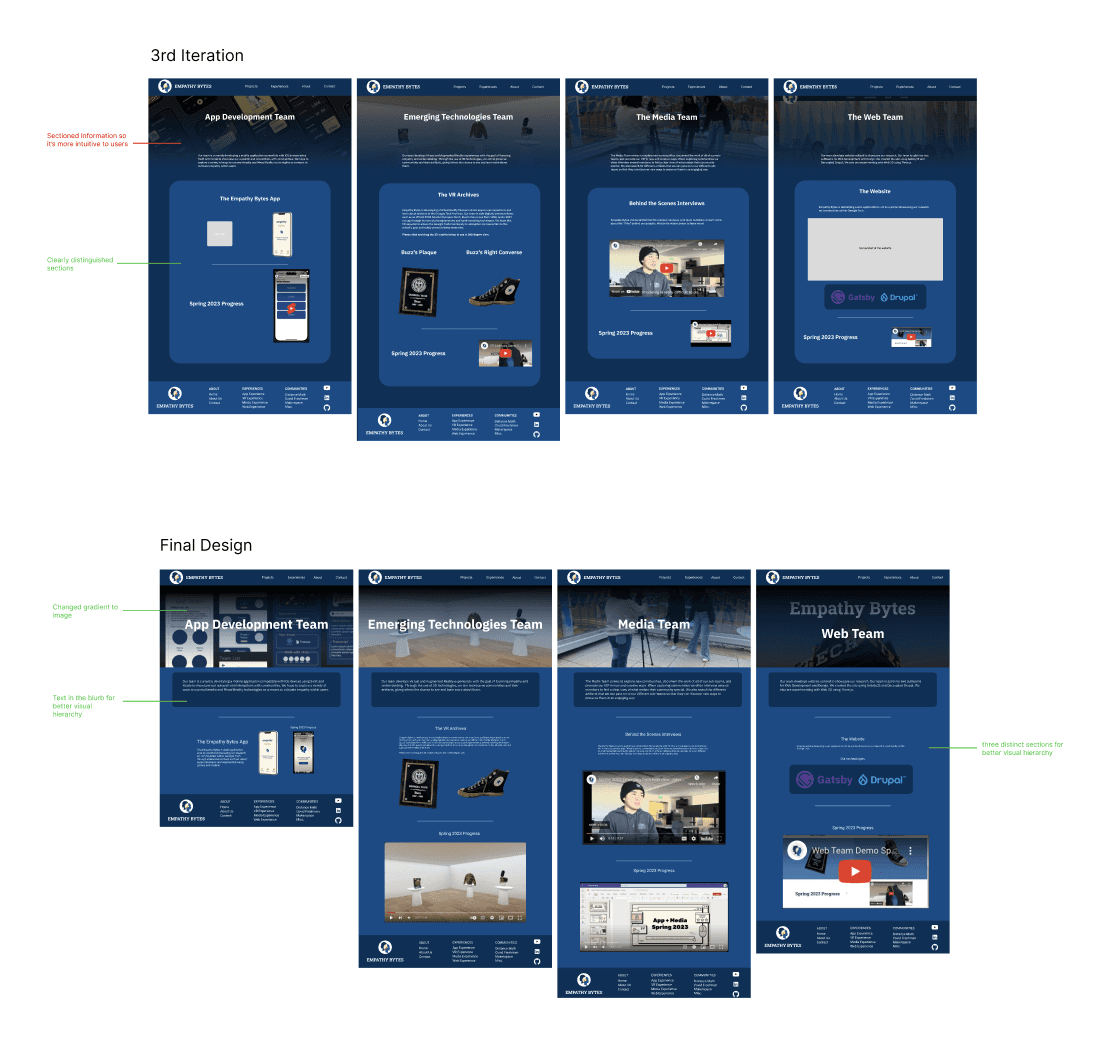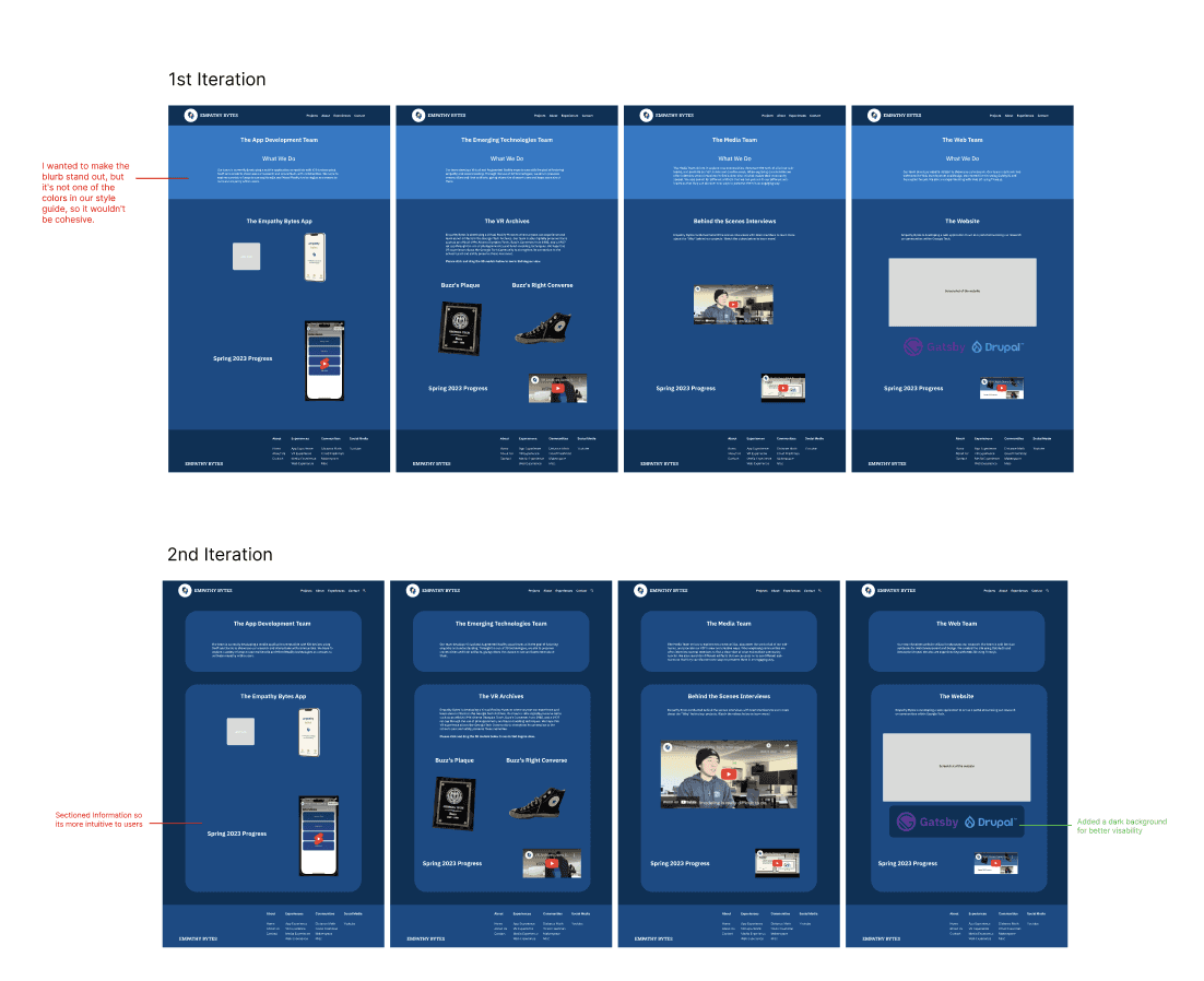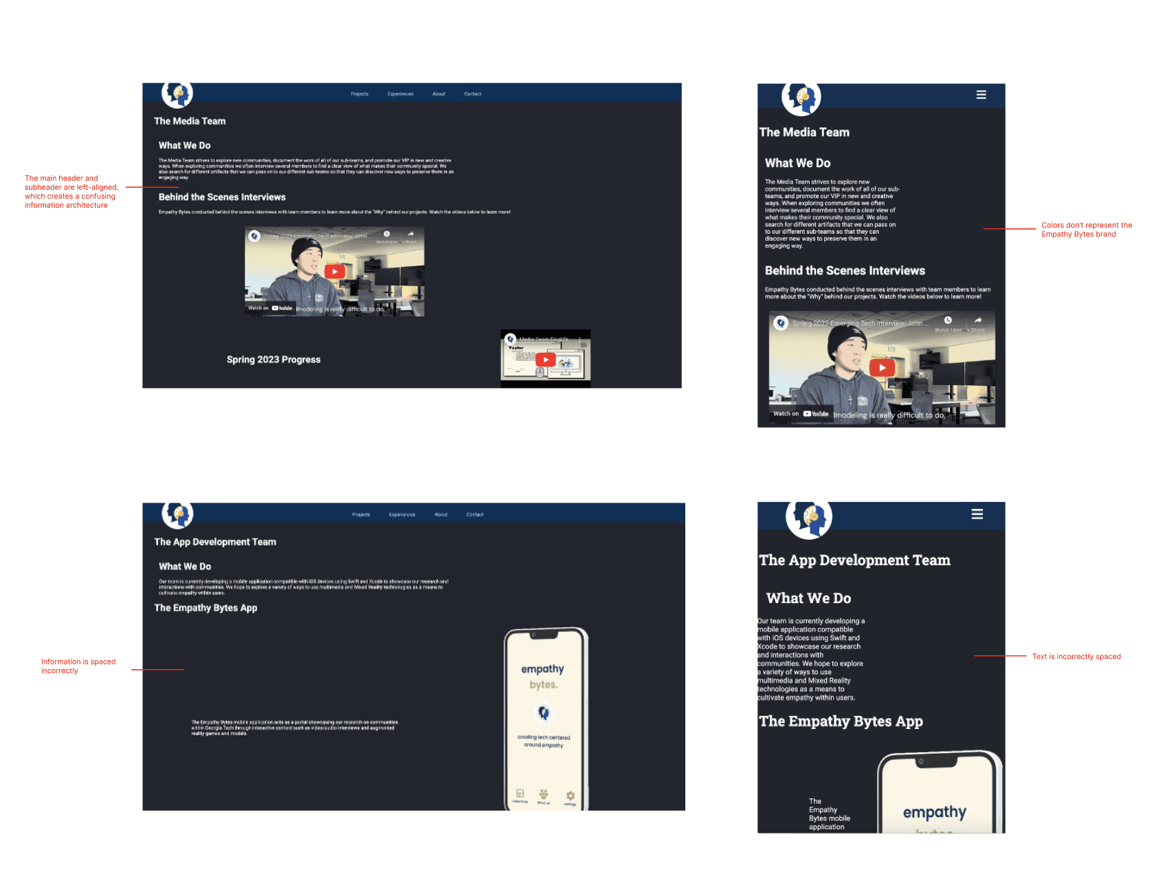 The original colors of the website were grey with blue accents. We felt this didn’t align with the Empathy Bytes brand, especially since the logo itself didn’t include grey. We decided to choose colors from our logo and incorporate our school colors, which eventually led us to create a cohesive style guide.
